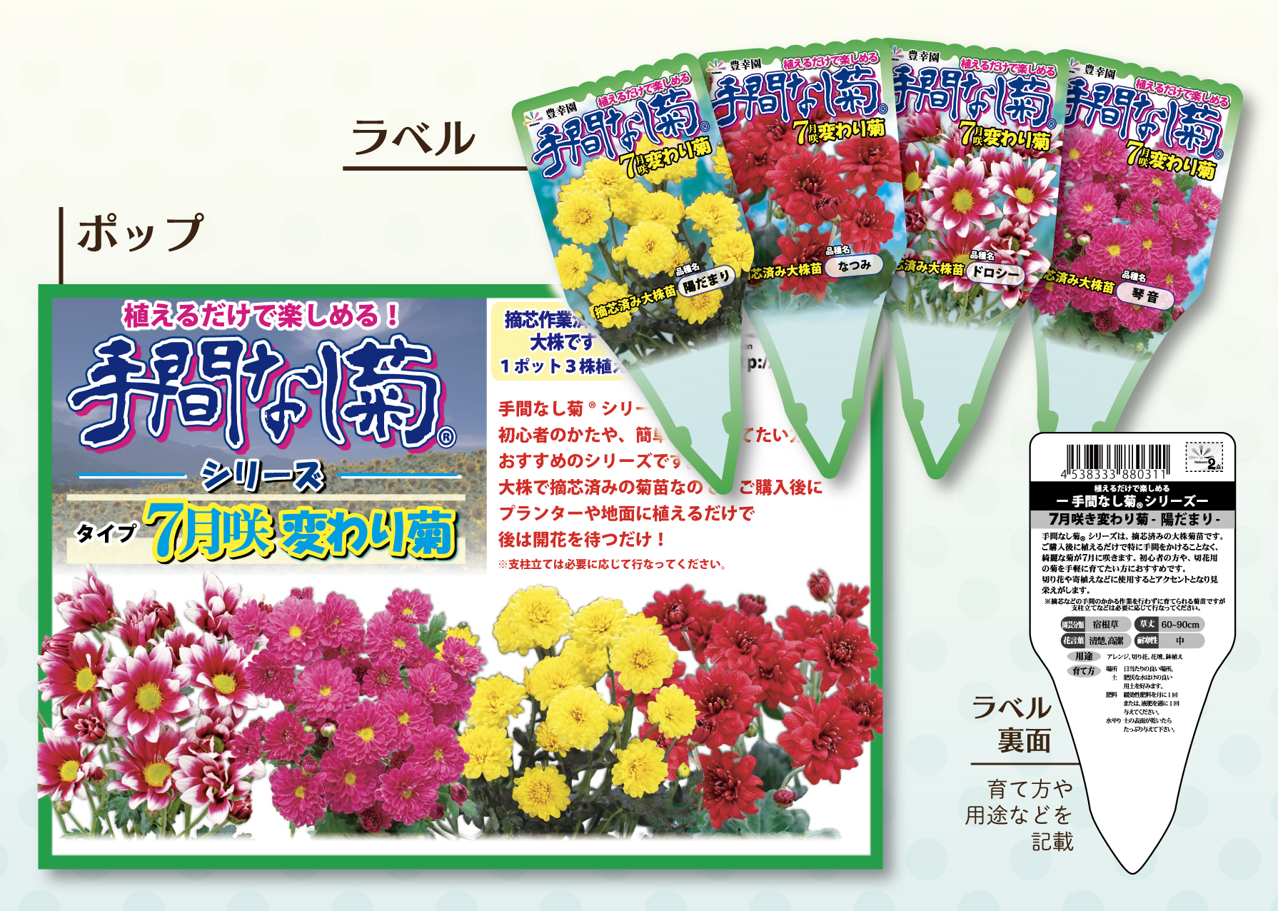 カラーポットで花色が簡単に分かります。最近では大株苗も好評です